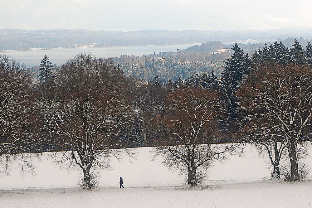Es war ein Spaziergang zur Ilkahöhe bei sibierischer Kälte, als mir der einzelne Mensch auffiel, der die Allee entlang ging. Im Hintergrund der Kirchturm von St. Nikolaus und der Starnberger See.