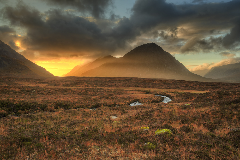 Einer der wohl meist fotografierten Berge Schottlands: der Buachaille Etive Mor, übersetzt "der große Hirte", steht hier im goldenen Licht eines herbstlichen Nachmittags.