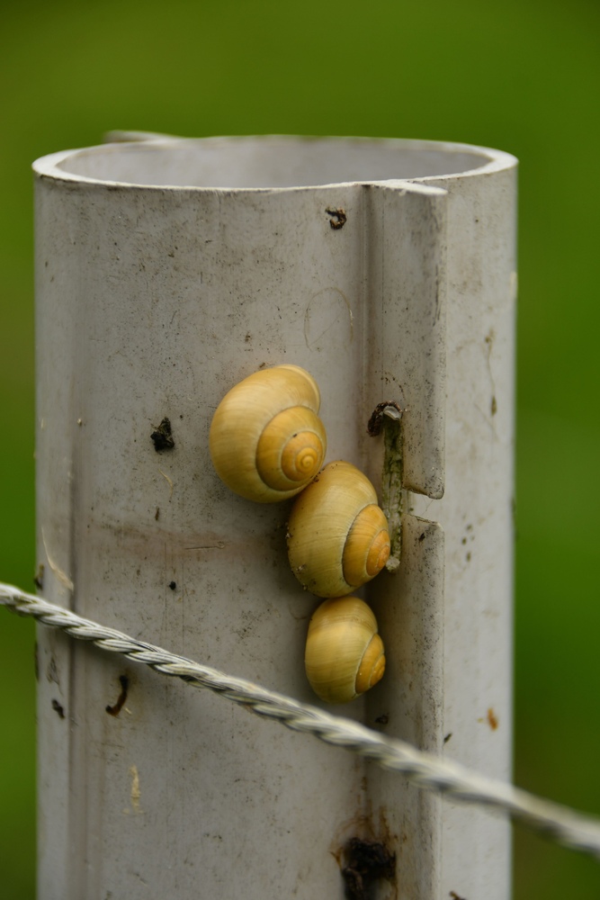 Aufgereiht am Zaunpfahl fand ich diese Schnecken bei einem Spaziergang. Es waren nicht die letzten, die mir an diesem Tag begegnet sind. War wohl gutes Wetter für Schneckenausflüge.