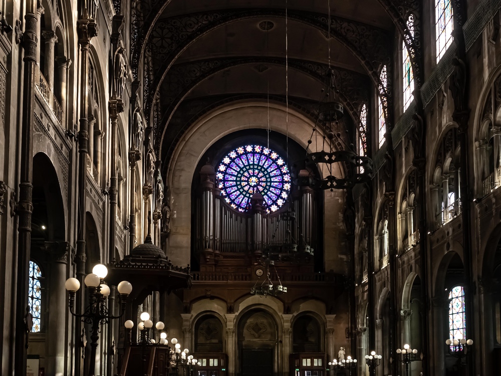 Orgel und Fenster der Kirche Saint Augustin in Paris. Erbaut von Victor Baltard, Erbauer der berühmten, leider abgerissenen, Hallen, dem Bauch von Paris.
