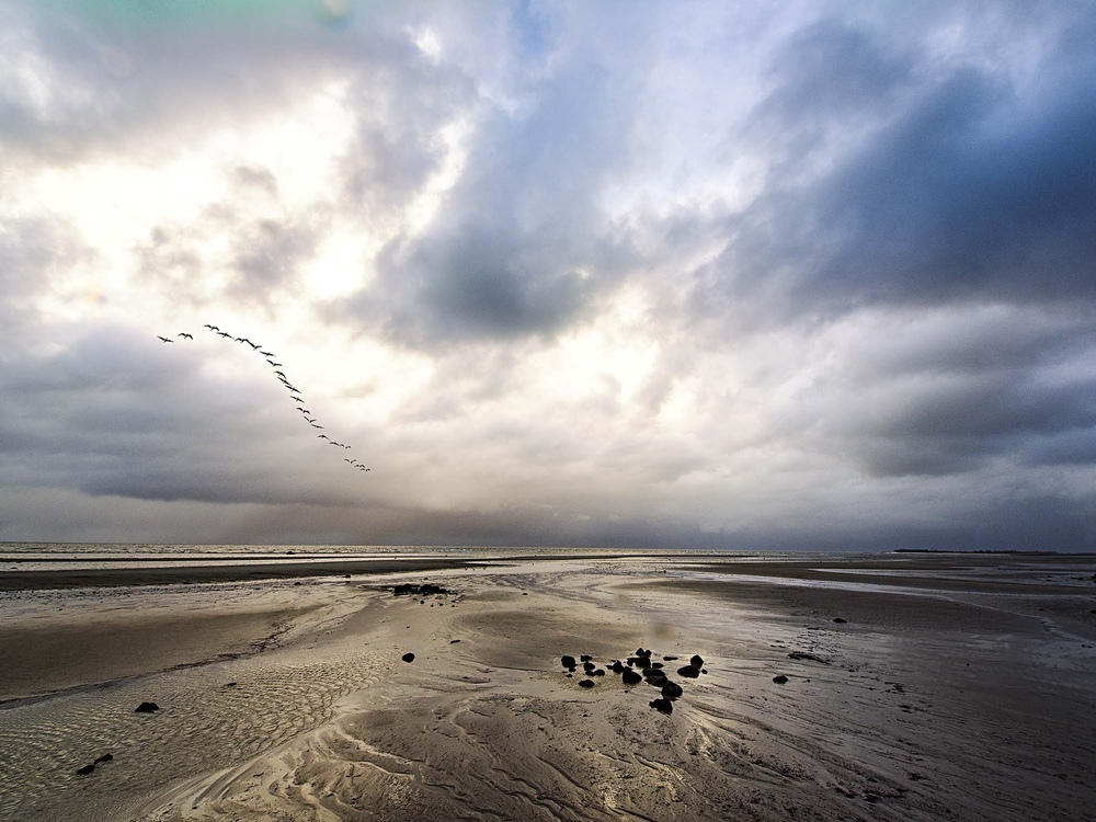 Vogelzug in ungemütlicher Wetterlage. Die Kraniche (oder die Wildgänse) suchen das Südliche). Gute Bild-Dramaturgie - hell/dunkel der Himmel, hell/dunkel der Strand (oder das Watt). Gefällt mir gut.