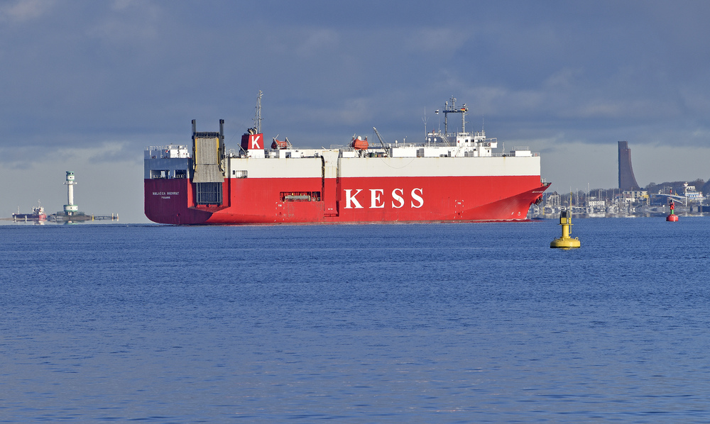 Hier bei der Ausfahrt aus dem Nord-Ostsee-Kanal, links der Leuchtturm Friedrichsort, recht das Marine-Ehrenmal in Laboe.