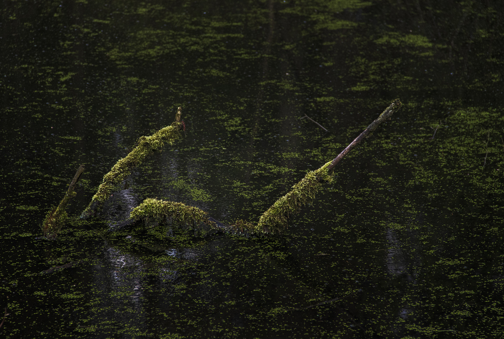 Ja, so stelle ich mir ein versumpftes Gewässer vor, im Halbdunkel eines Waldes. Etwas unheimlich mutet es an mit den herausragenden bemoosten Ästen, aber auch eine gewisse Neugier spürt man , was sich wohl unter der Oberfläche befindet.