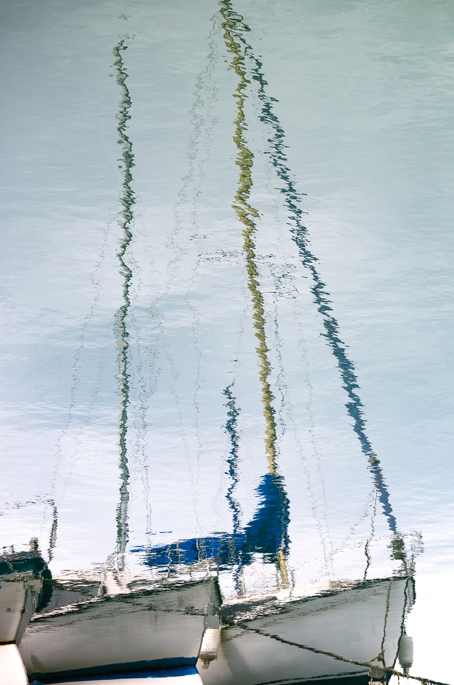 kleine Bildserie von abstrahierenden Wasserspiegelungen im Hafenbecken eines bretonischen Yachthafens
