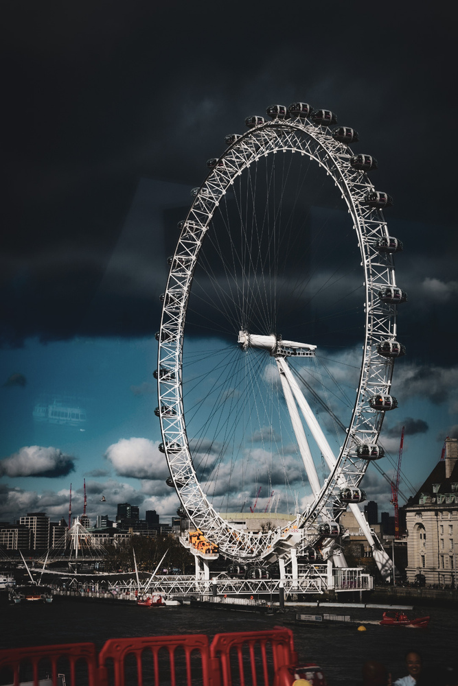 Leider nur ein Schnappschuss aus dem Bus heraus. Mit Spiegelung... ich fand aber die Wolkenteilung in der Mitte des Rades gut und habe mal drauf gehalten. Ob die die roten Barken Sinn machen ist fraglich, vielleicht ein Kontrast.