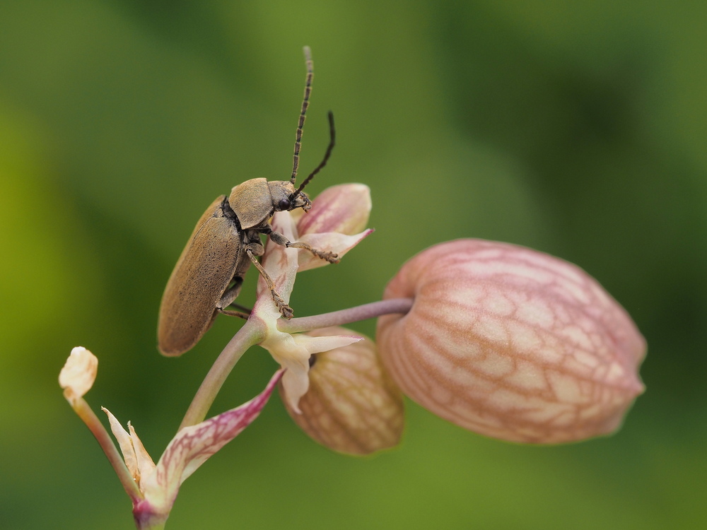 21.07.2024Von etwas weiter weg verschmilzt er vermutlich fast mit der Blüte, so dass er für Freßfeinde schwer zu entdecken ist. Deinem Käferauge ist er nicht entgangen und du hast obendrein ein sehenswertes Bild komponiert mit der zarten Blüte vor sattem Grün, Petra. LG, Sabine