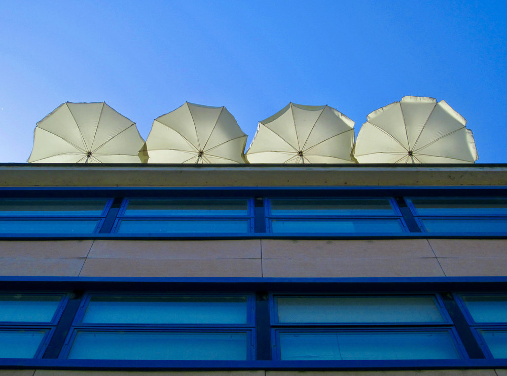 Schöner Kalt-Warm-Kontrast, wie ein letzter Gruß winken die "warmen" weissen Schirme vom Dach, bevor die "kalte" blaue Zeit des Herbst und Winter kommt. Schön gestaltet mit der Froschperspektive.