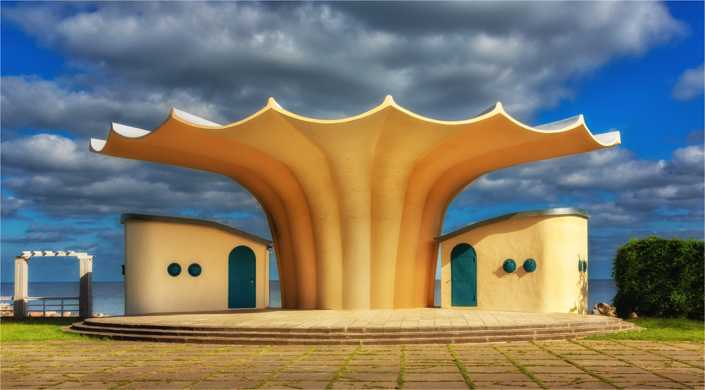 26.09.2024Ein filigranes Bauwerk, das so leicht wirkt wie die Kurmusik, die meistens darunter gespielt wird. Die vermutlich tiefstehende Sonne bringt die Farben zum Leuchten und die Wolkenformationen wirken tatsächlich so, als würden sie aus der Muschel aufsteigen. Schön gestaltet mit dem breiten Format und den kraftigen Kontrasten.