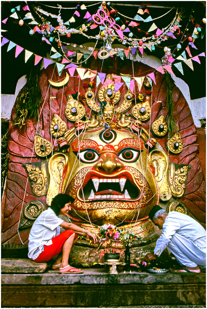 Das ist schon ein starker Kontrast zwischen dem grauseligen Antlitz der Gottheit und dem fröhlichen Ritual der Opferfreudigen. Der Frohsinn wird durch die bunte Farbenpracht von und um Gott und Mensch noch weiter gesteigert. So klappt es mit der Zähmung des Wüterichs ganz bestimmt. Dein gelungenes Foto, Dieter, lässt da keine Zweifel aufkommen.