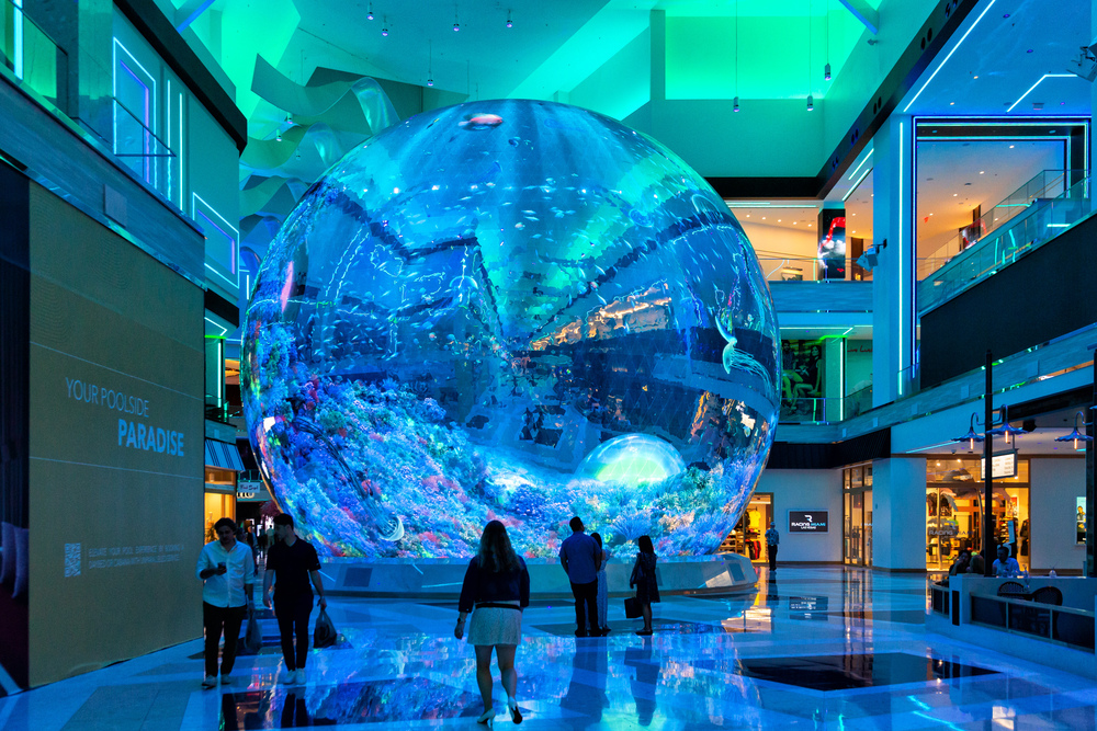 08.09.2025Das "Paradies am Pool" bezieht sich wahrscheinlich auf die gerade in der Kugel animierte, wässrig-blaue Darstellung. Das alles überstrahlende LED-Blau hat eine überwältigende Wirkung, was man allein schon an der interessierten Haltung der meisten Passanten erkennen kann. Hinzu kommt, dass die raffinierte Kugel auch die Dimensionen des Komplexes erkennen lässt. Das gesamte Gebilde steht in seiner runden Geschlossenheit in einem starken Kontrast zur kantigen Innenarchitektur, was seinen Reiz nochmals erhöht.
