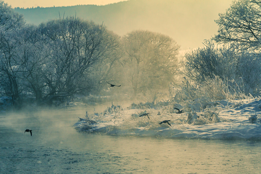 Donau, Winter, Enten, morgen, kalt, jahreszeiten, himmel, Natur, landschaft, fluss, vögel, |