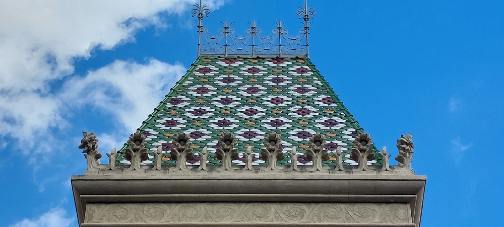 Das im Foto gezeigte Dach ist nur ein kleines Beispiel der verspielten und farbenfrohen Architektur in seinen Gebäuden. Da Gaudí ein Gebäude als Gesamtkunstwerk empfand, entwarf er auch die kleinsten Details im Gebäudeinneren selbst. Seine Entwürfe führten die Schmiede- und Mosaikkunst, die Tischlerei und die Glaskunst zu neuen Höhepunkten. Seine Stilelemente beeindrucken mit schlichten, aber originellen, vielfach organischen Formen. (Quelle: Wickipedia)