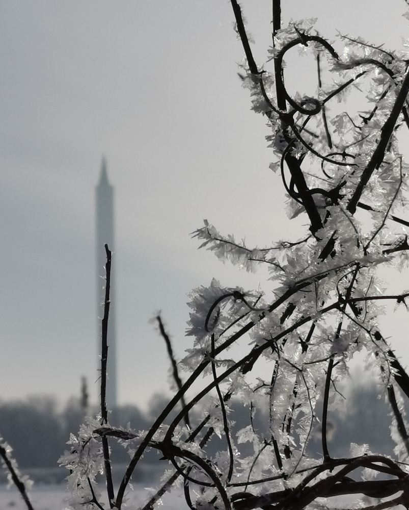 Die Frostkristalle, das dunkle Holz und der Turm im Hintergrund geben eine starke Komposition. Der Ast, der Turm spielt, ist dabei das i-Tüpfelchen, wobei der Turm selber wie ein gespitzter Bleistift in den Himmel ragt.