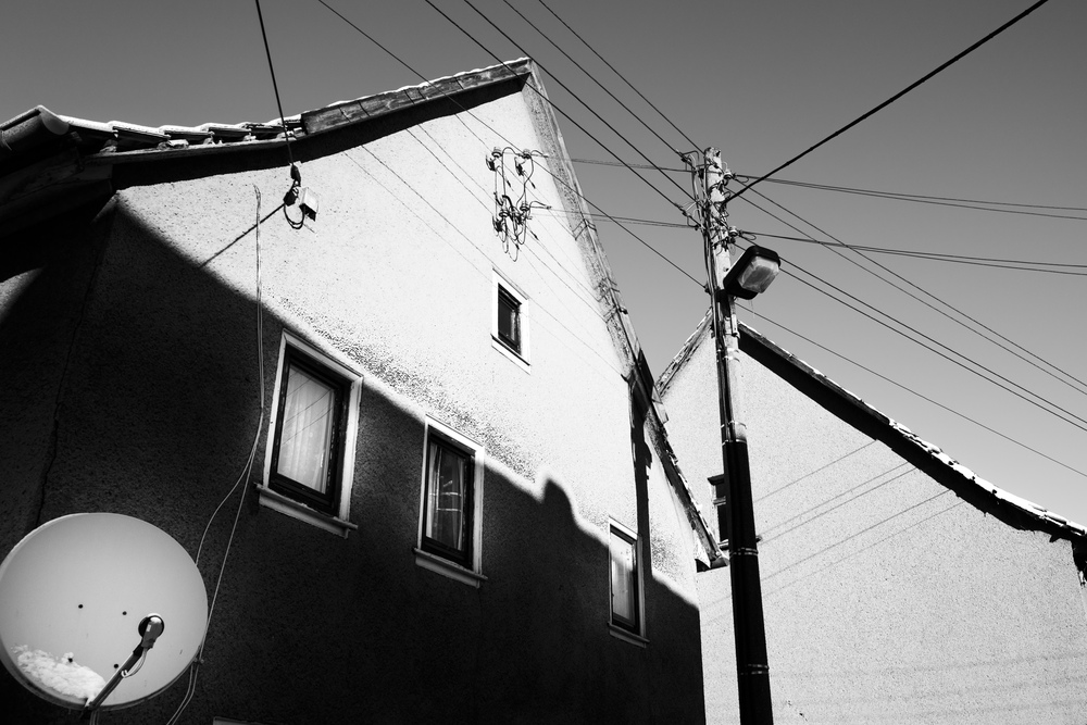 Dorfszene mit Giebeln und Kabeln. Auf einem Spaziergang bei klarer, tiefstehender Sonne entdeckt.