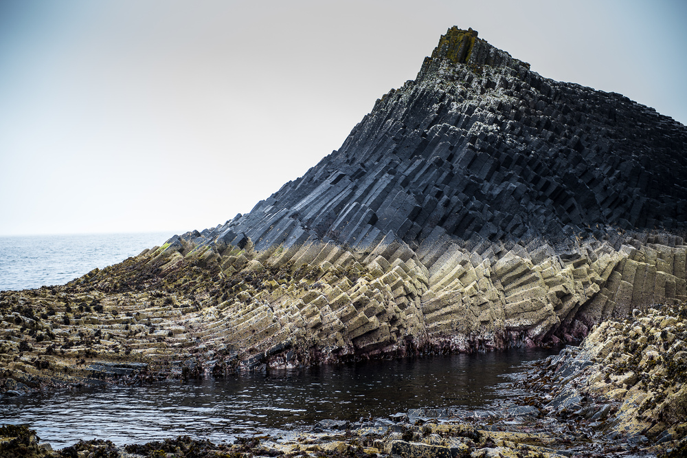 Diese Version ist eindeutig besser wie die die du danach eingestellt hast. Bildgestaltung bzw. Raumaufteilung kommt unserer Leserichtung sehr entgegen. Auch wird hier im groben der goldene Schnitt angeboten der ja bekanntlich die meisten Betrachter anspricht. Am wichtigsten empfinde ich hier aber das diese Naturerscheinung der (fallenden) Steinsäulen den Blick des Betrachters unterstützt. Steigt man links im Bild ein geben die Säulen gefühlsmässig nach da sie flach auf dem Boden liegen oder aber nur leicht ansteigend sind. Passt auch zu dem schmalen Streifen mit dem Wasser davor. Wandert der Blick weiter ins Bild nach rechts nimmt die Steigung der Säulen zu je höher der Fels wird. Ein optischer Widerstand wird spürbar der durch die dunklere Farbe noch unterstrichen wird. Auf dem Weg zum Gipfel fühlt man dann die Gegenkraft die vorhanden war/ist um ein umfallen der Säulen zu vermeiden. Dieser Aufstieg mit den Augen wirkt durch eine aufsteigende Diagonale (positive Diagonale) entsprechend gut und nicht bedrohlich, obwohl Kraft und Energie dieser Verformung spürbar ist. Das Wasser am unteren Bildrand und die Felsen ganz rechts unten vermitteln zusätzlich Tiefe.