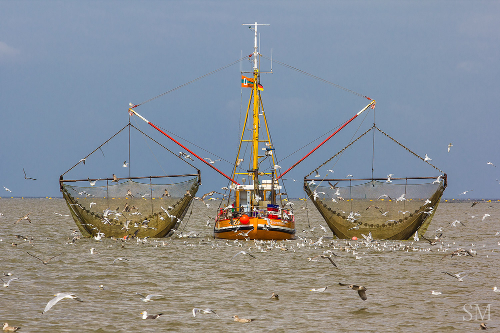 ..belagern diesen Krappenkutter in der Hoffnung auf einen dicken Happen. Dabei war dieser Kutter gerade erst aus dem Hafen von Hooksiel ausgelaufen um die Technik zu testen. ;)