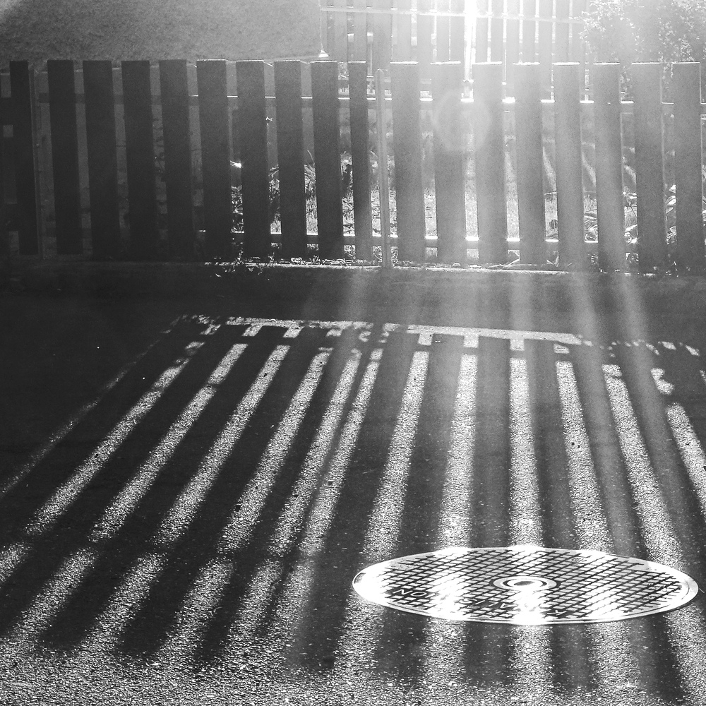 Schön dieses Schattenspiel, dass das Licht auf den Gehweg zaubert. Der runde Deckel bildet einen guten Kontrast zu den geraden Schatten der Zaunlatten. Gefällt mir richtig gut. LG Karin