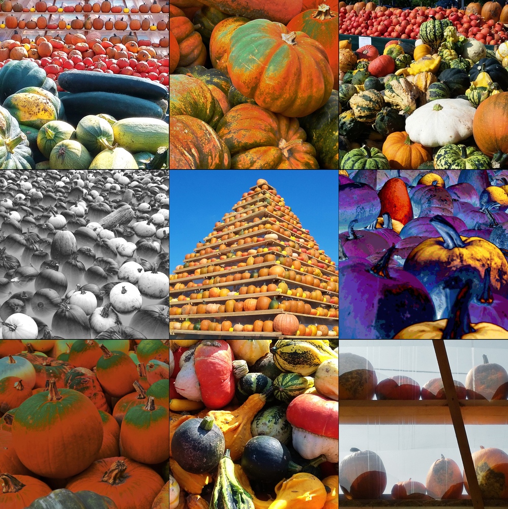 09.10.2017Lothar hat es trefflich kommentiert, so bleibt mir nur anzuregen, die Bilder unten rechts und das SW durch ähnlich farblich gehaltvoll malerische Bilder wie die anderen auszutauschen. Zusätzlich würde ich versuchen die Kürbispyramide soweit zu verkleinern, dass sie ganz in der Mitte zur vollen Entfaltung kommt. Insgesamt eine feine Idee dies Tableau. lg peter