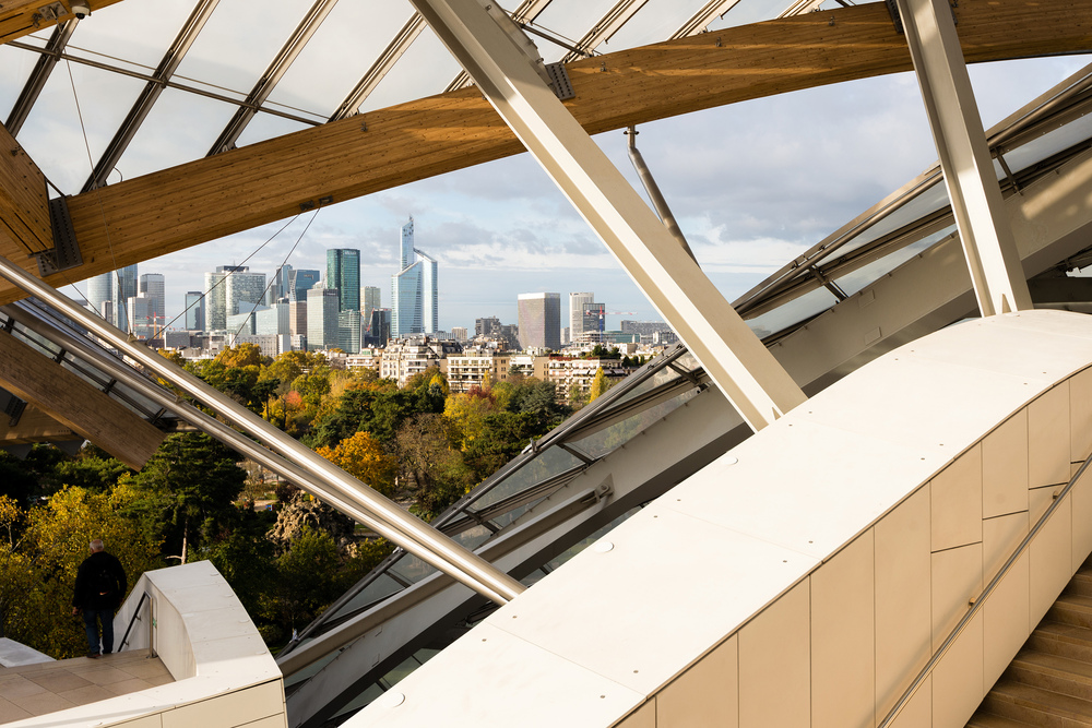 Der "Standardblick" von der Fondation Louis Vuitton auf La Défense eingerahmt vom Gestänge der Dachkonstruktion als alternative Variante zu meiner vorhergehenden Sicht.