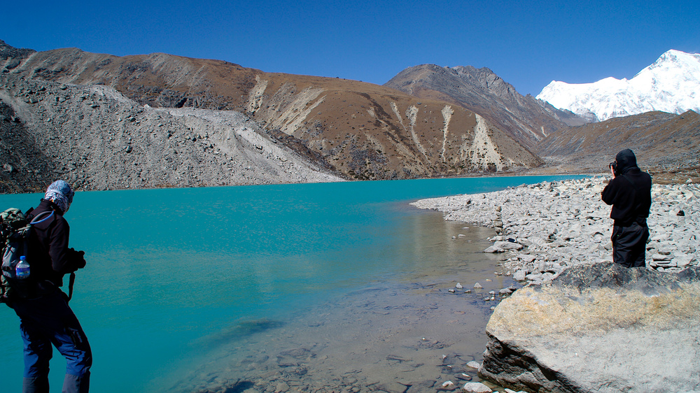 Am 2.Gokyo-See kann man sich am klaren blauem Wasser nicht genug satt sehen. Im Hintergrund der schneebedeckte Cho Oyu mit seinen 8.210m.