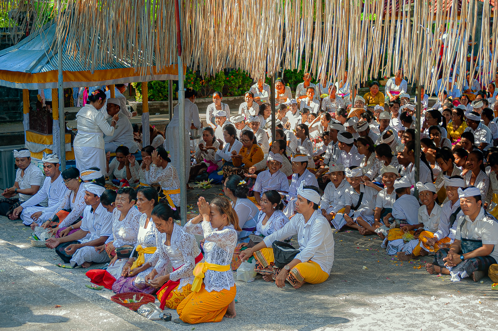 Bei der Segnung durch die Pemangku Priester werden die Gläubigen mit heiligen Wasser bespritzt.
