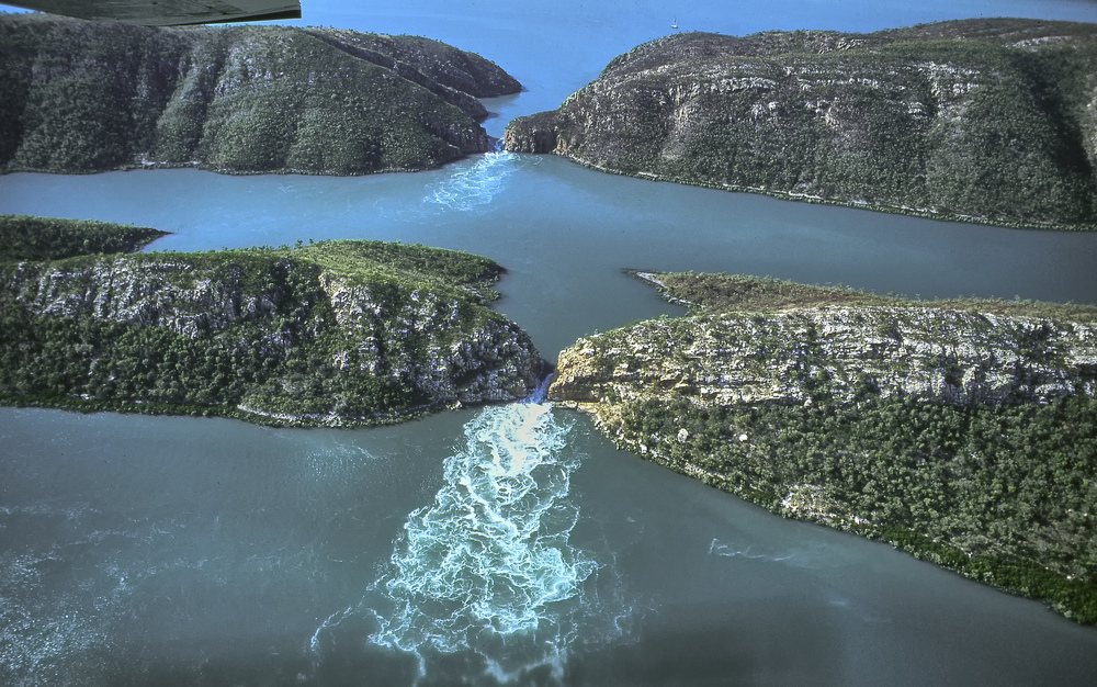 Obwohl das der Name zunächst vermuten lässt, handelt es sich bei den Horizontal Falls keineswegs um Wasserfälle, sondern lediglich um schmale Abflüsse von Seitenbuchten der den Gezeiten unterworfenen Talbot Bay.
