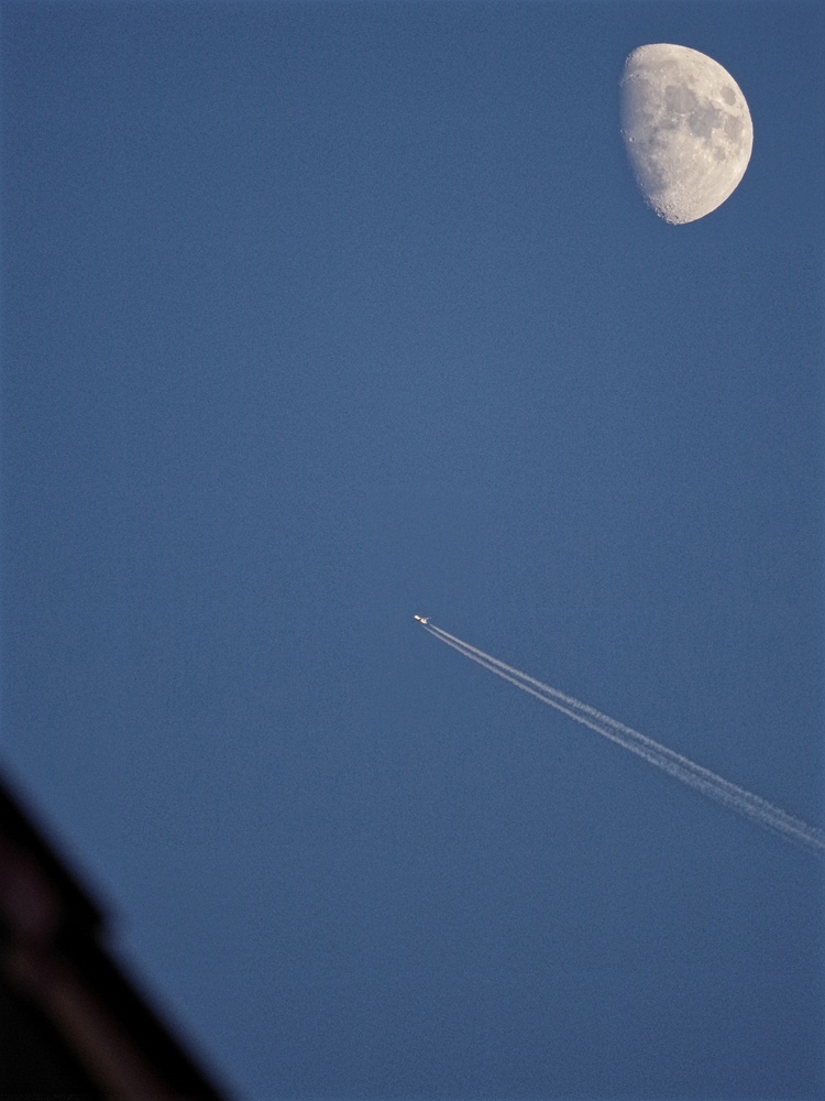 Gut das Du Deine Kamera griffbereit und im richtigen Moment ausgelöst hattest. Hier passt alles, der strukturierte Mond, das Flugzeug, das mit seinen Kondensstreifen eine Bilddiagonale zieht und die diffuse Dachkante. Klasse!