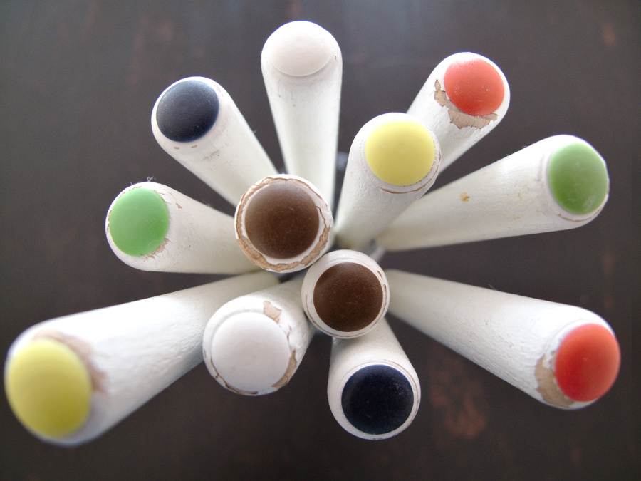 Ein paar abgerockte Fondue-Spieße, als Strauß zusammengebunden und in einem Wasserglas auf einem dunklen Tisch fotografiert.
