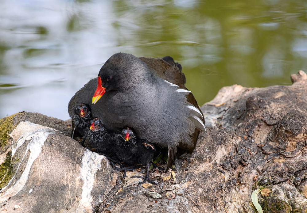 Sehr schön dieses Foto von der Teichhuhnmutter die nicht nur brütend auf dem nest sitzt sondern ihre Kleinen beschützt und die schauen schon mal in die Welt.