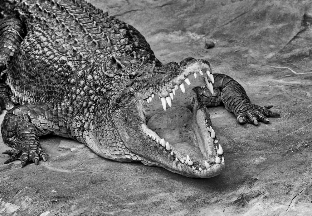 Da bleibt die Frage was Du dem Krokodil gezeigt hast dass es das Maul so weit öffnet, vielleicht solltest Du die Zähne zählen aber die wachsen ja laufend nach, schöne S/W Ausarbeitung.