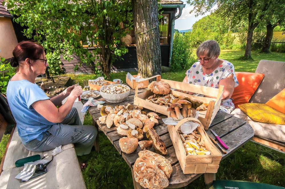 Ein schönes Symbolbild für die aktuelle Jahreszeit und die Ausbeute der Pilzsuche ist ja beeindruckend. Fehlt nur noch ein Glas vom Roten, damit das Putzen leichter von der Hand geht. :-)
