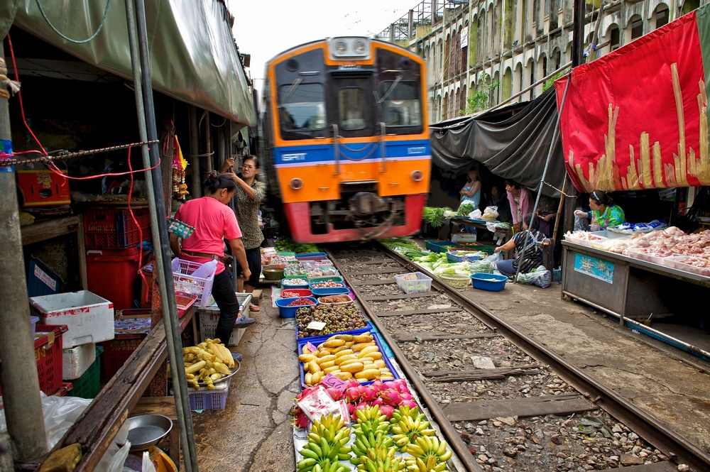 Die Eisenbahn in Samut Songkhran fährt nicht sehr häufig am Tag. Aber, die 'Mae Klong Railway Station' liegt ideal für einen Markt.