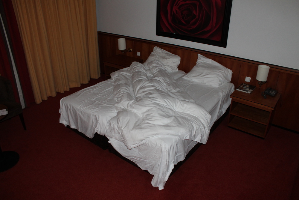 Hotelzimmer in einem veränderten Zustand. Kurz vor dem Auschecken baue ich auf dem Bett, aus vorhandenen Gegenständen (Handtücher, Bademäntel etc.), eine Installation, fotografiere das Bett und verlasse das Zimmer.