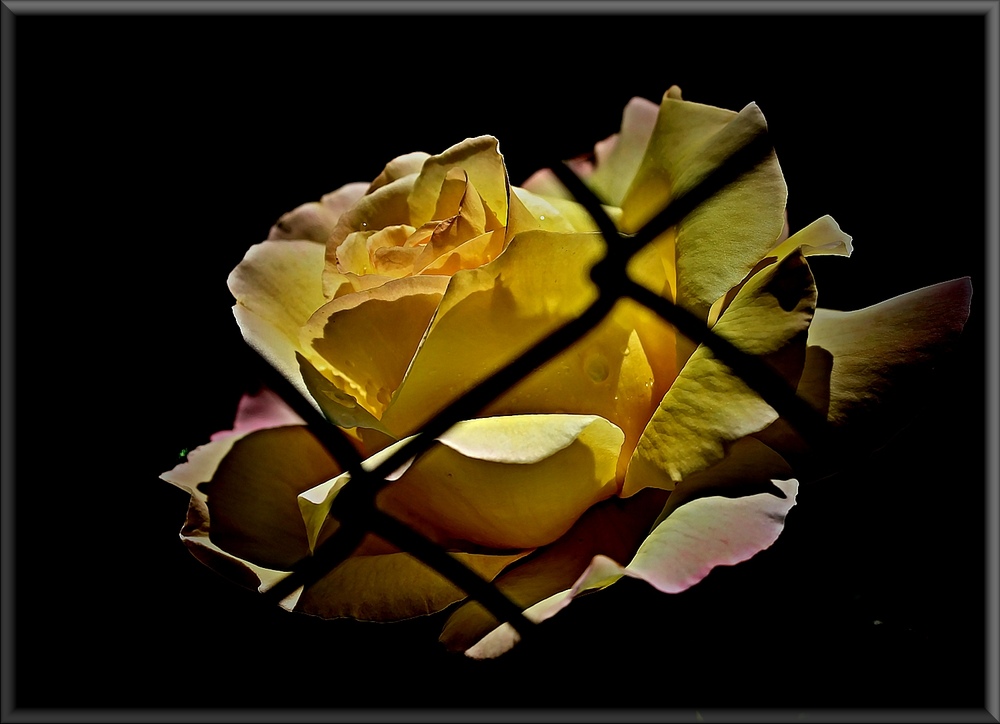 Rose in Nachbars Garten durch den Zaun abgelichtet