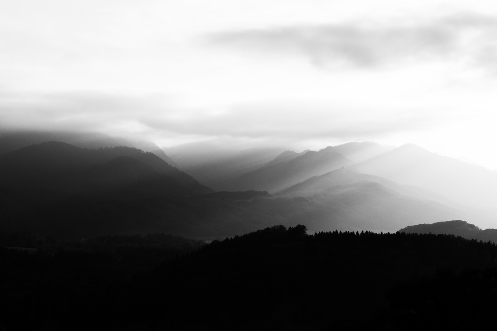 Der Nebel in den Bergen mit s/w Konvertierung