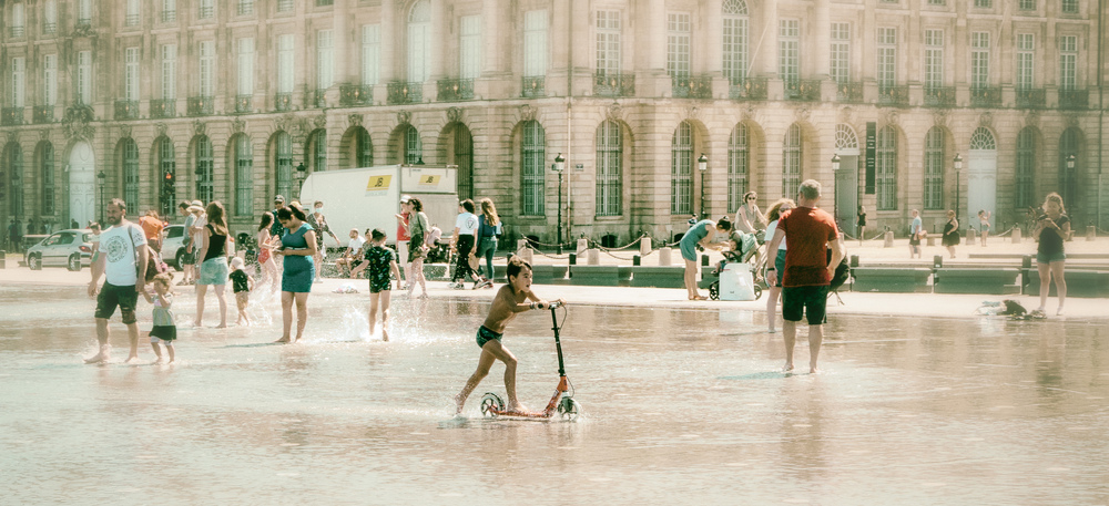 Auch hier sind die Farben etwas reduziert eingesetzt. Eine sehr schöne sommerliche Stimmung, und auch hier mit sehr guter Verteilung der einzelnen Leute im Bild bzw. der Hauptprotagonisten, dem Herrn rechts, dem Rollerfahrer und der Gruppe links.