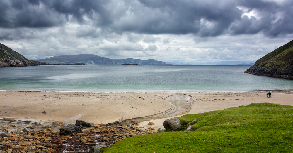 10.12.2020Eine Landschaft wie aus einer "Kerrygold-Werbung" - kräftige Farben, intensive Wolken, zwei Menschen die am Strand die Fels-, Meer- und Wolkenlandschaft genießen können. Sehnsuchtsort kommt mir dazu noch in den Sinn - die Schönheit der Schöpfung hautnah spüren.