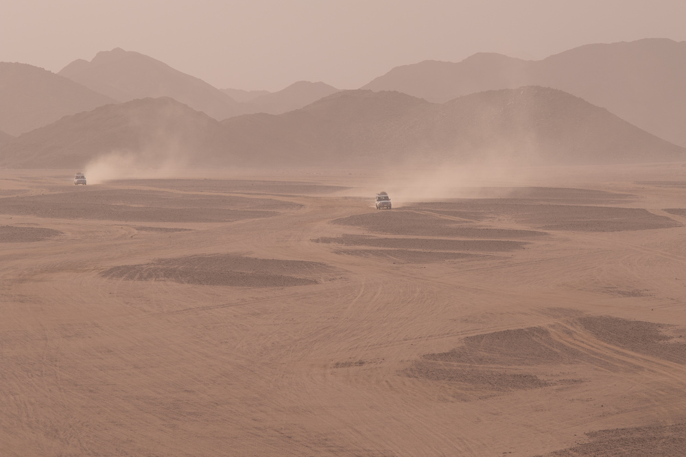 Tolle Tiefenstaffelung, die beiden Offroader verdeutlichen die große Weite des Areals. Sofern die Färbung nicht natürlich durch Sandsturm zu Stande kam, hast du diese monochrom Klasse gewählt. Ein blauer Himmel hätte nur ein kitschiges Kalender- / Urlaubsbild ergeben. Hier bekommt die Aufnahme ein ganz eigenes Flair.