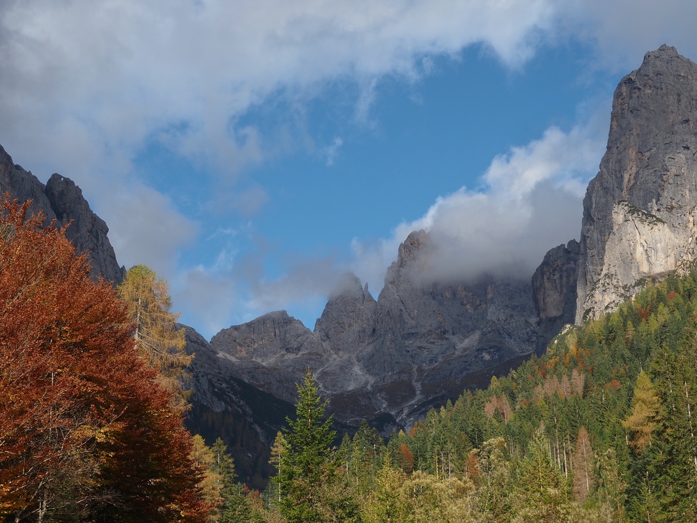 herbstliche Landschaft im Val Canali in den Pala-Dolomiten nahe der Malga Canali