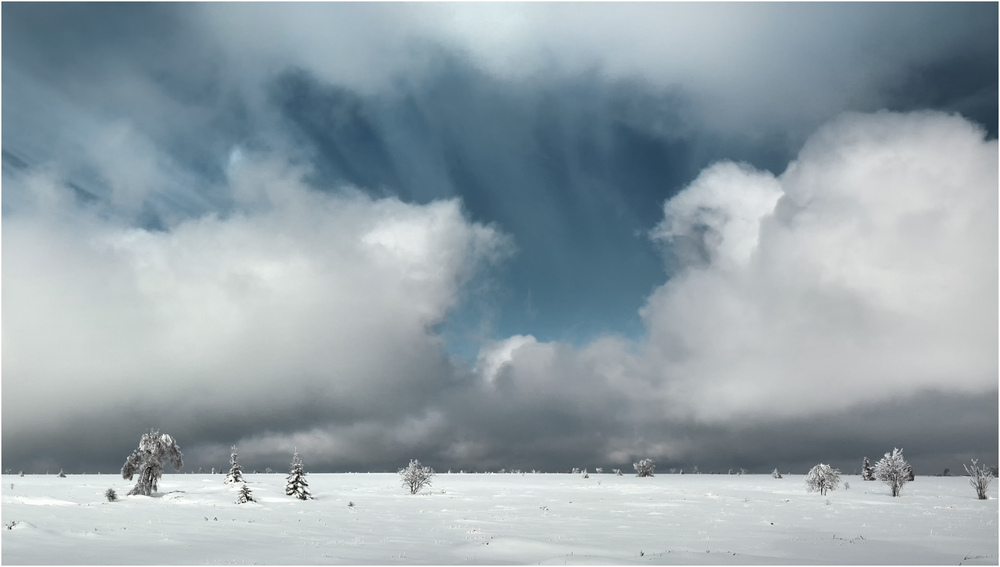 09.01.2022Fast schon surreal. Klasse Gegensatz zwischen den freundlichen Farben und den weich fluffigen Wolken zu ihrer "Gewalt", mit der sie auf die winterliche Landschaftz stürzen,