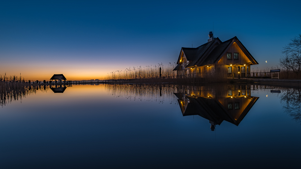 15.03.2022Ein Naturkomposition. Wunderschön, das erleuchtete Haus und der Streifen Sonnenaufgang beleuchtet zusätzlich die Szenerie.