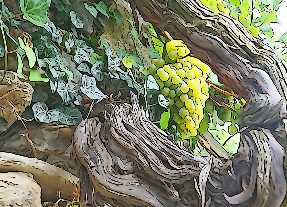 Hinter dem knorrigen Weinstock reifen die dichten Weinreben des grünen Veltliner heran.