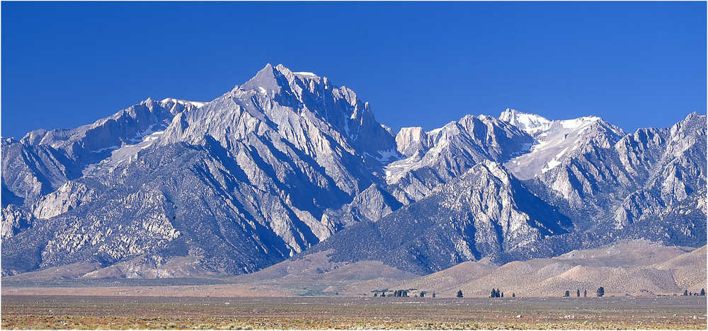 mächtig erhebt sich die schroffe zerklüftete Bergekette vor der flachen Landschaft.