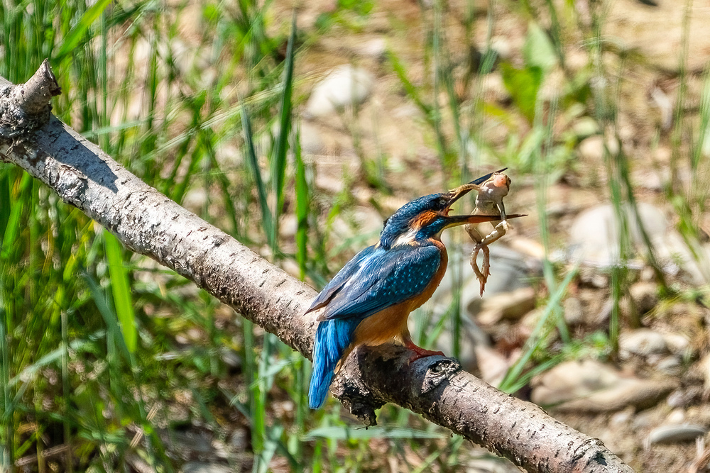 Die Eisvögel sind ganz schön brutal mit ihrer Nahrung. Der Frosch ist schon sichtlich angeschlagen. Wehrt sich aber trotzdem noch......oder es sieht zumindest so aus.