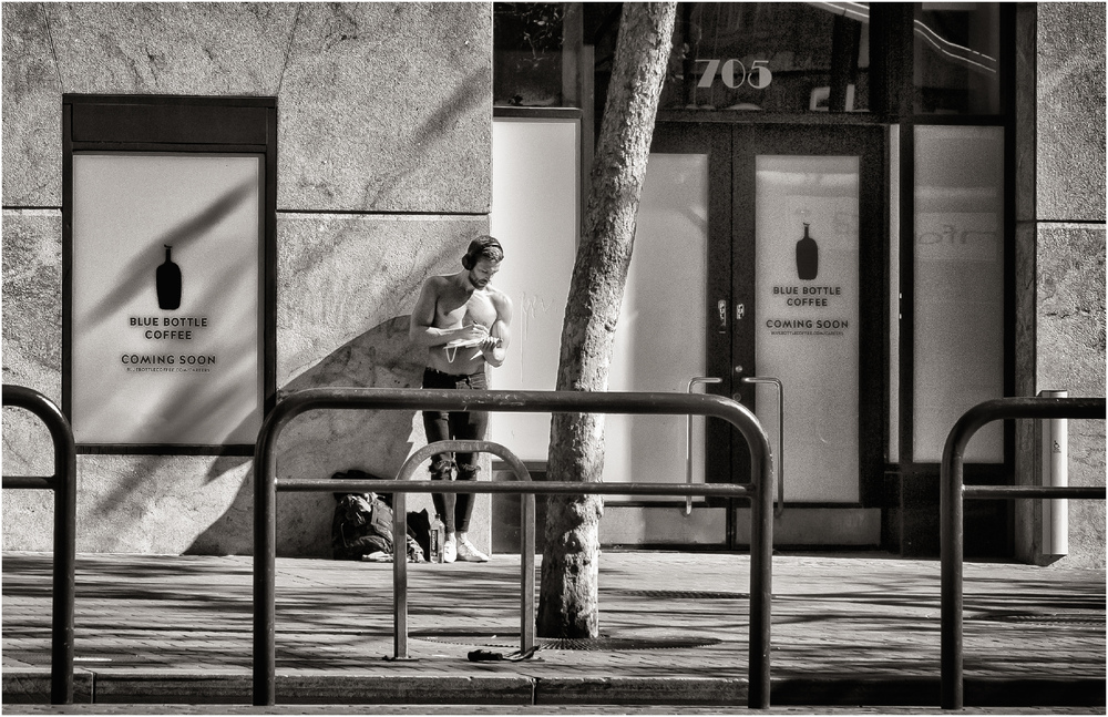 11.02.2023Eine Stadtszene. Gut gesehen. Mann mit Tablet (?). Nur, dass er doch sehr ungewöhnlich in Position steht. Mit Rucksack und Wasserflasche vor einem Coffeshop. Ein Tourist mit freiem Oberkörper bestimmt das Foto. Ola, la.