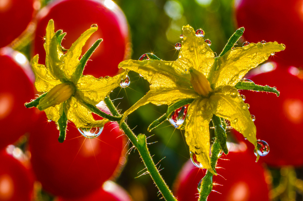Um die Spiegelung der dahinter angeordeten Tomaten in den Tropfen an der Blüte  abzubilden ist eine sorgfältige Anordnung notwendig. Derartige Experimente haben aber trotz der Ausdauer die notwendig ist auch einen Reiz.