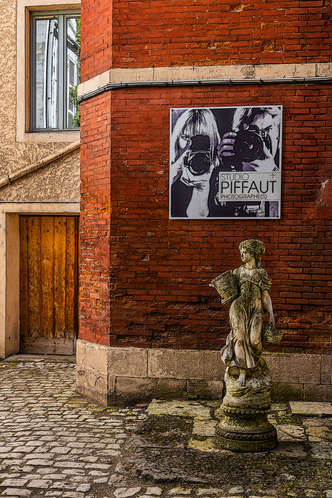 Als hätten die Piffauts die kleine Statue im Fokus. Die Gegensätze von Schwarzweiß und Farbe einerseits sowie die beschauliche Ecke in Chalon und das reißerisch anmutenden Plakat andererseits, erzeugen Spannung in deinem gut gestalteten Ausschnitt. Die warme Farbigkeit ist ganz nach meinem Geschmack.