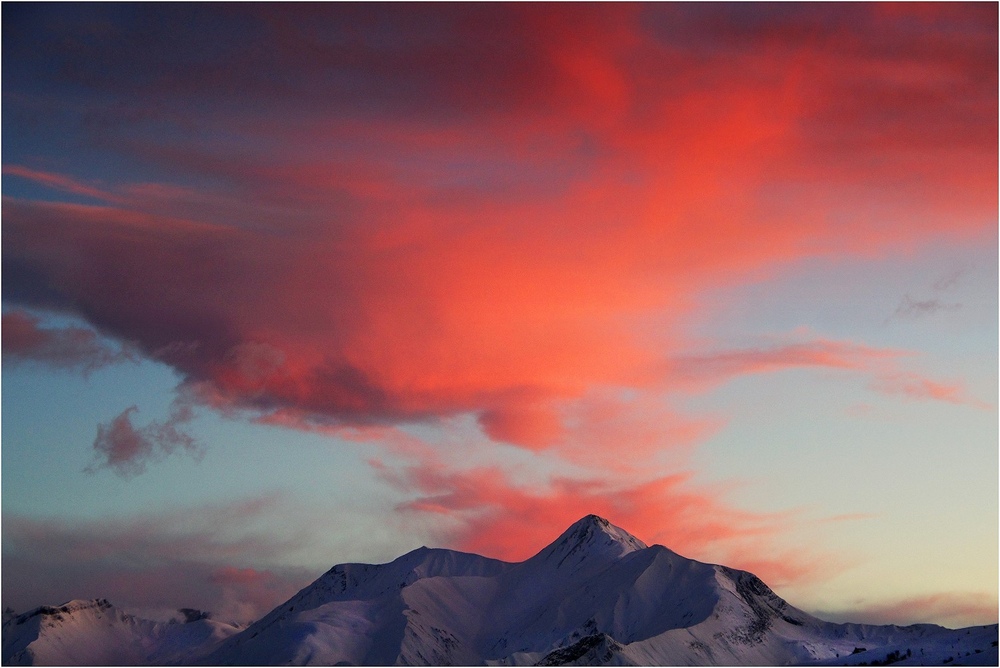 Die diffusen Wolkenformationen reflektieren die untergehende Sonne auf wunderbare Weise. Zudem stehen sie in einem starken Kontrast zu den scharf gezeichneten Bergen. Der rot-blaue Farbkontrast schließlich macht das Bild perfekt.