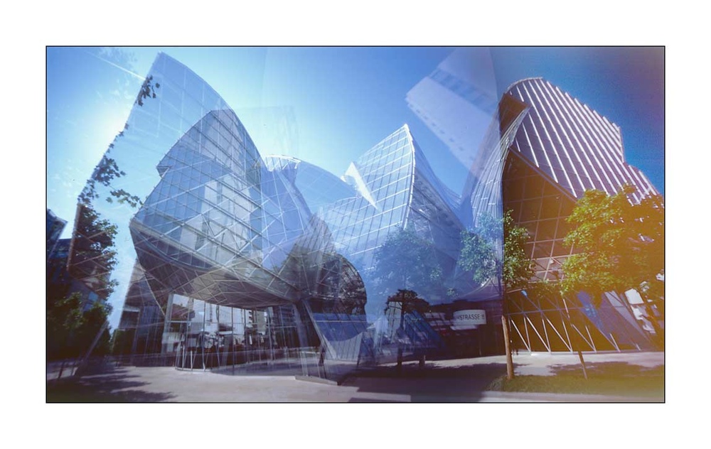„Gehry-Gebäude, Novartis-Campus, Basel; Pinhole-Mehrfachbelichtung“