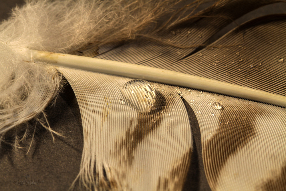 Ein wunderbares Motiv, diese Feder, die die Wasserdiamanten trägt. Es ist so schön, wie die Tropfen Perlen bilden und die Feder nie wirklich nass machen... Liebe Grüsse Jacqueline